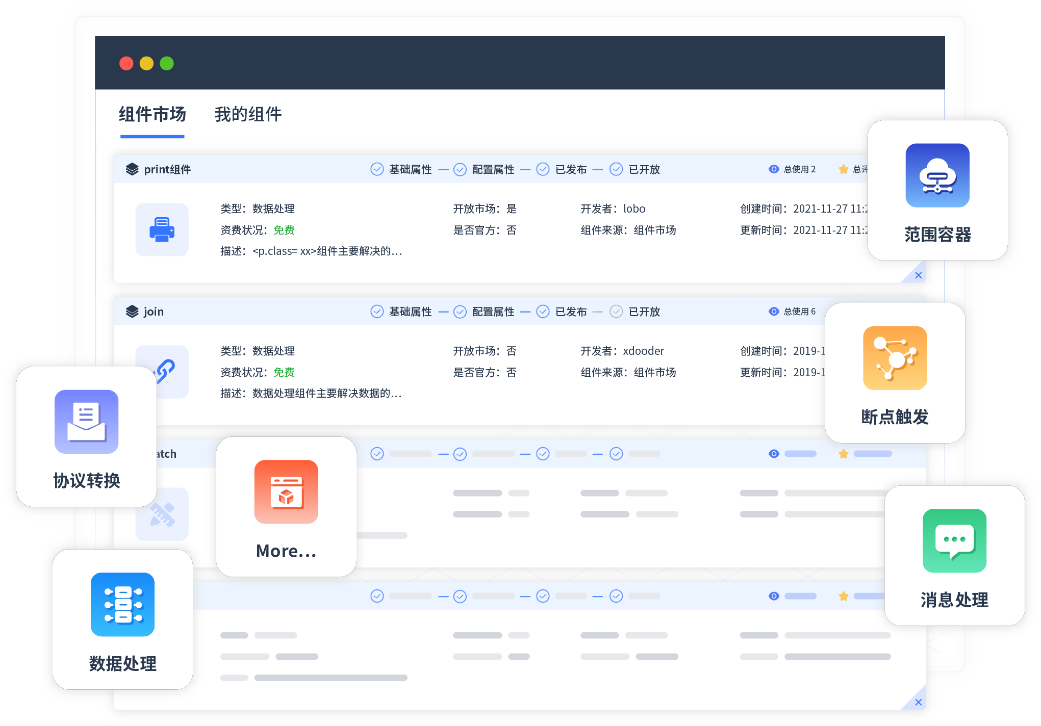 针对集成场景,头号玩家提供组件市场,例如协议转换、消息处理、文件操作等。除平台提供的组件外,客户可以自定义所需组件。